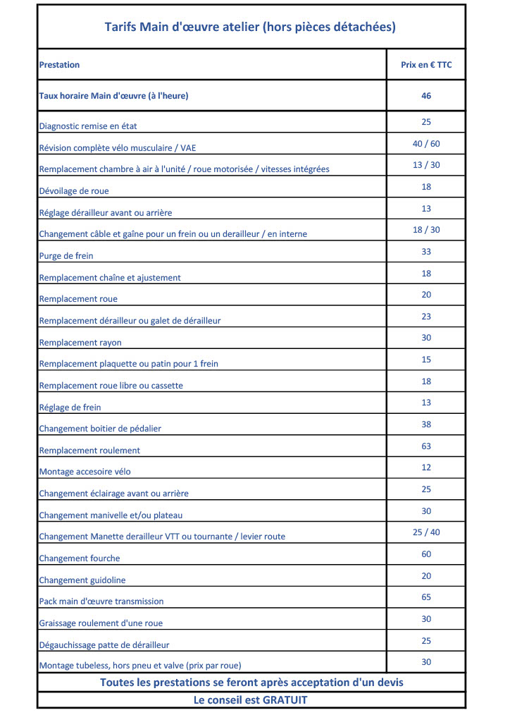 Tarifs Atelier